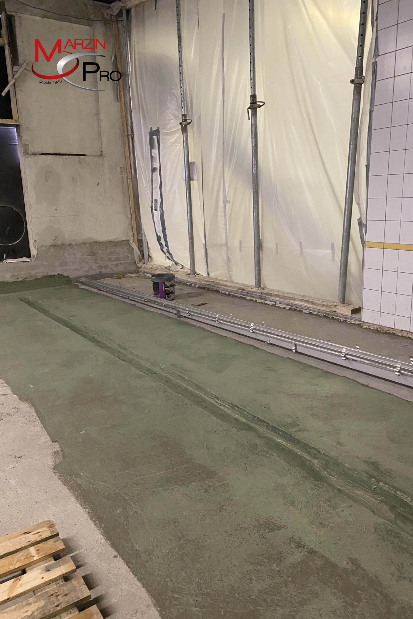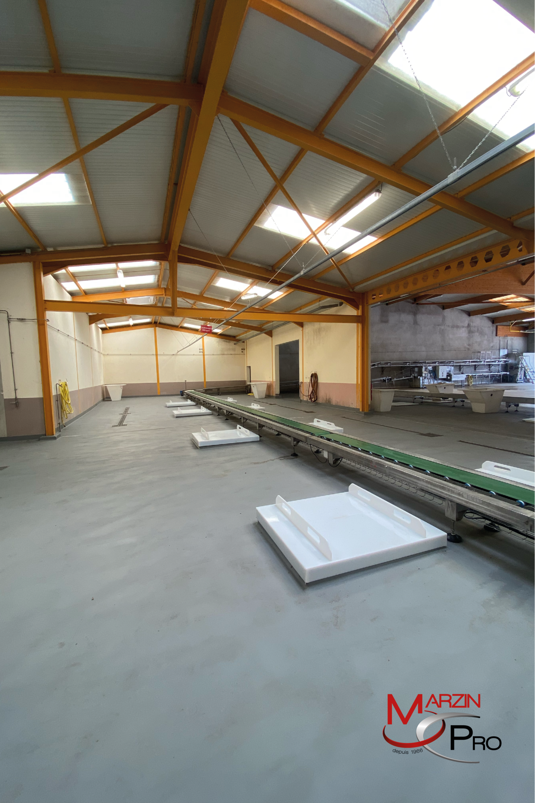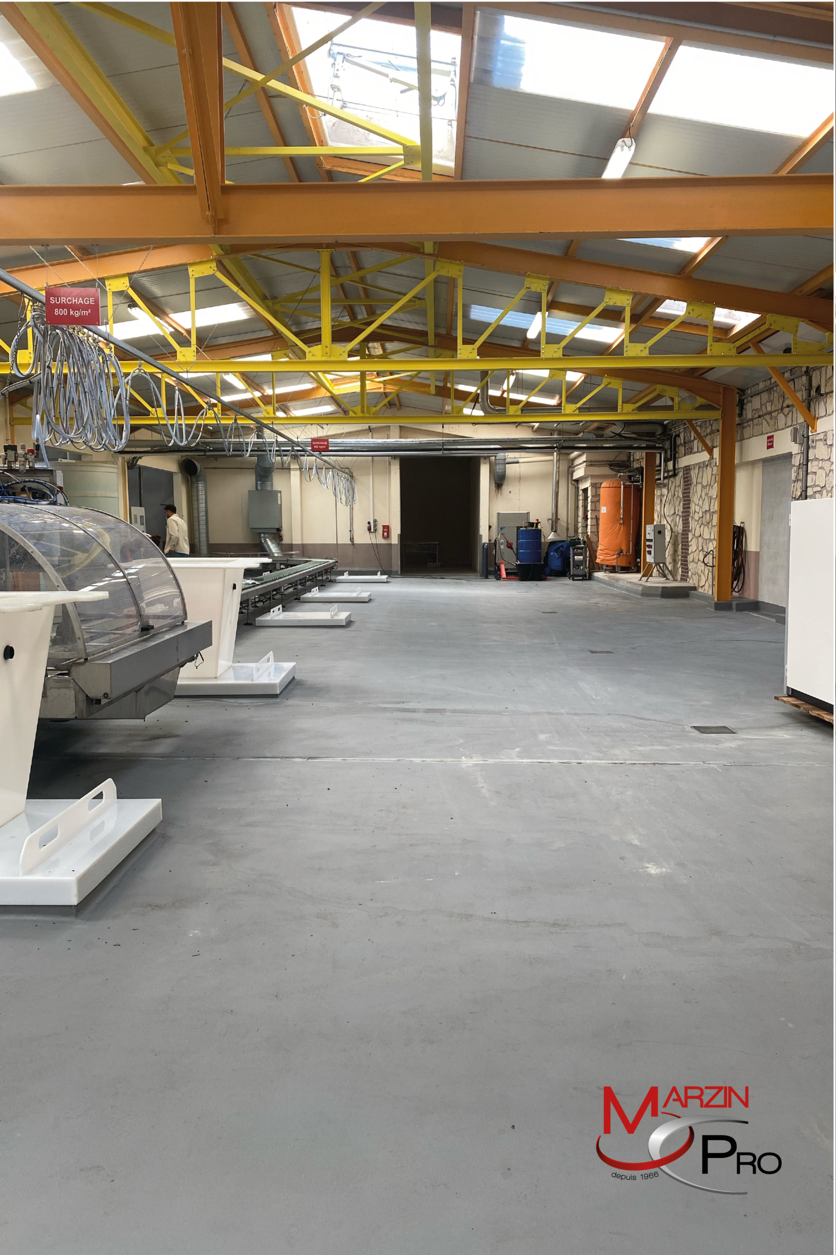 À cela s’est ajoutée la mise en œuvre d’un revêtement de sol en résine UCRETE polyuréthane ciment, type DP10, sur 1 000 m². Ce matériau, connu pour sa résistance chimique et mécanique, est parfaitement adapté aux contraintes du secteur. La prestation résine représente un chiffre d’affaires de 100 000 € HT pour 600 heures de travail.