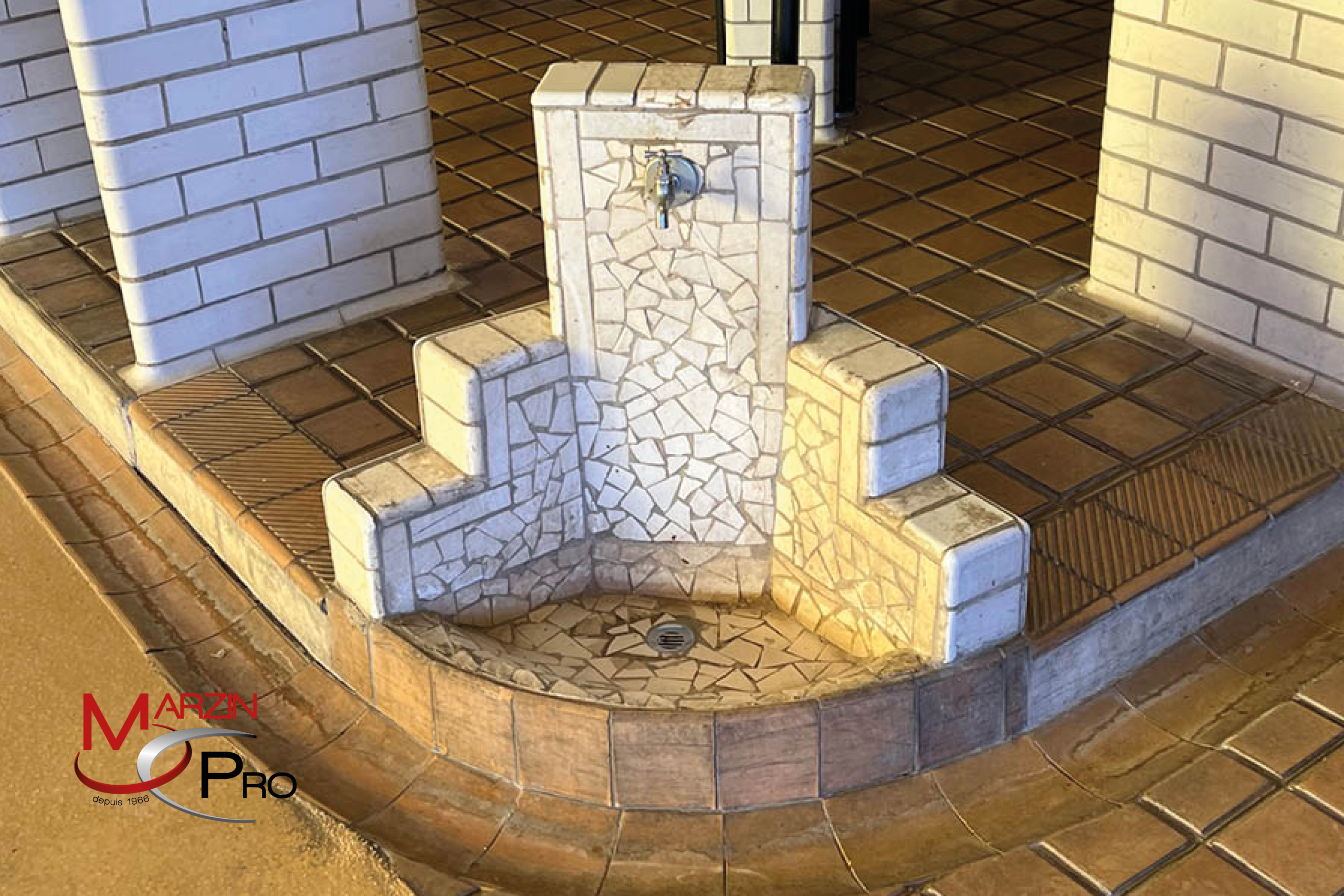 Les travaux ont débuté par la dépose complète du carrelage de sol existant. Une partie du carrelage d’origine a été réutilisée, tandis que des carreaux neufs ont été fabriqués sur mesure par contretypage afin de restituer fidèlement l’existant.Tous les joints ont été réalisés en époxy antiacide, adapté aux zones à fort passage.